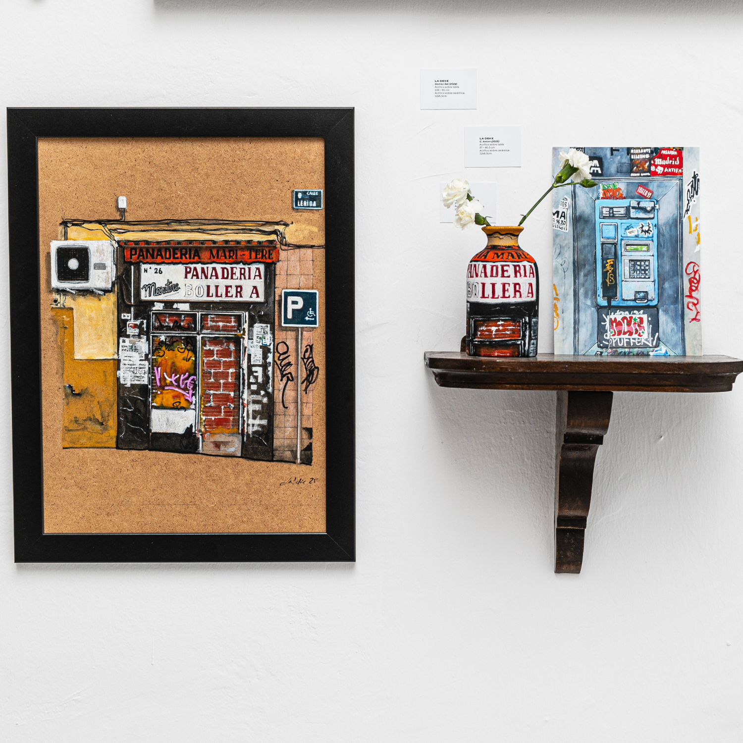 Acrílico, acuarela y poscas sobre tabla + acrílico sobre cerámica